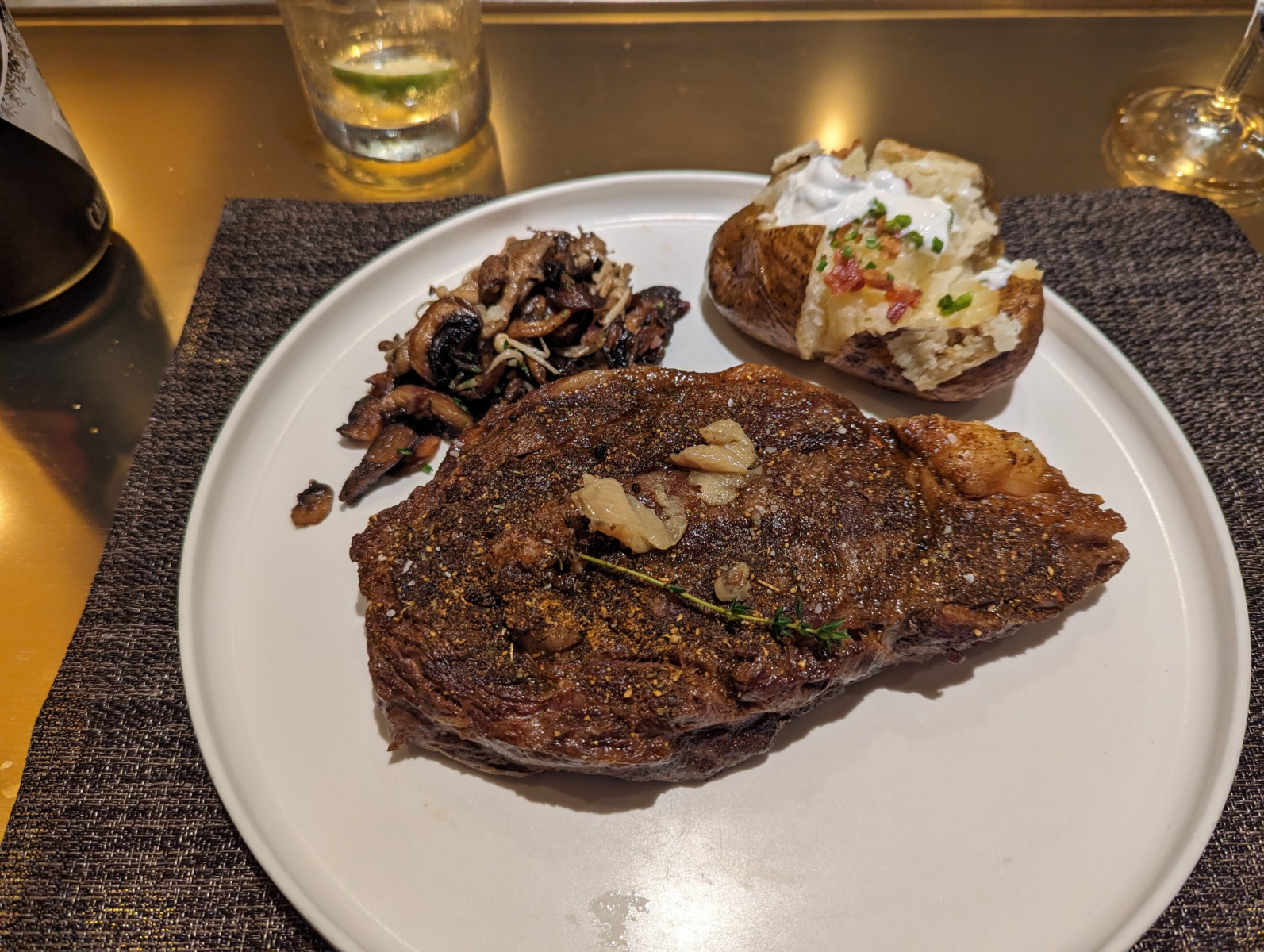 ribeye, baked potato, mushrooms