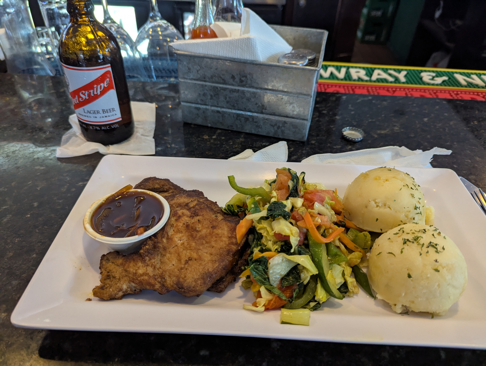 The food was all really good. I can’t complain about any of it. They do have patties (like empanadas) and I guess those were not all that but for just something to grab and go they work. I ate jerk chicken a couple of times and loved it so much. I went to a pretty famous place, Miss T’s, and had some garlic shrimp dish which was delish. I also had this pork chop plate and it was really good. The mixed veggies on that plate were worth getting seconds of.